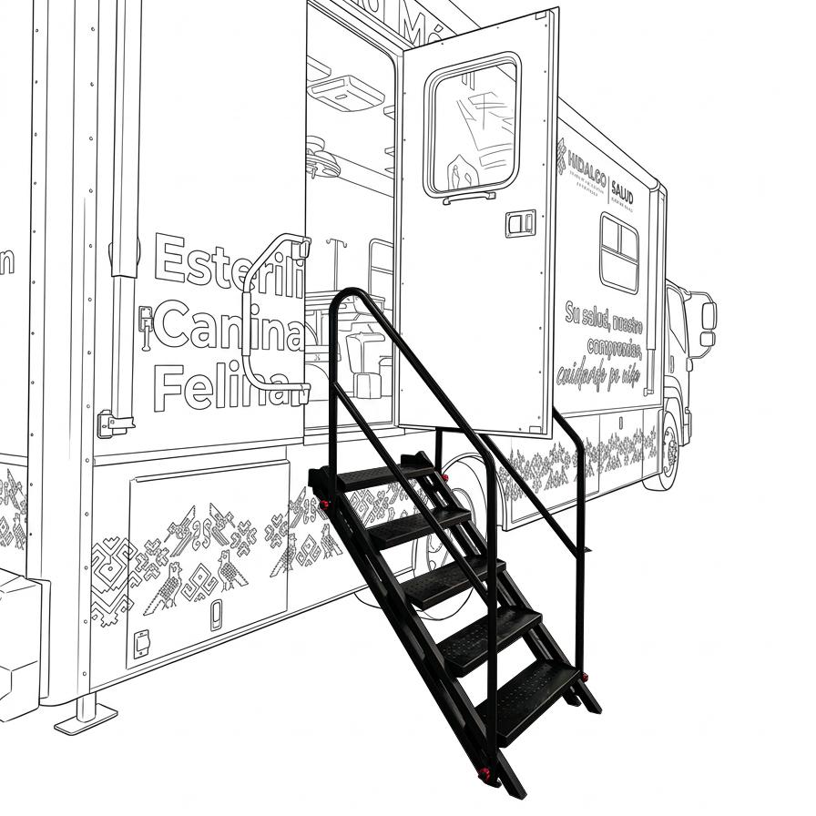 Fabricada con escaleras para facilitar el acceso a los consultorios, que pueden retenerse fácilmente dentro del vehículo.