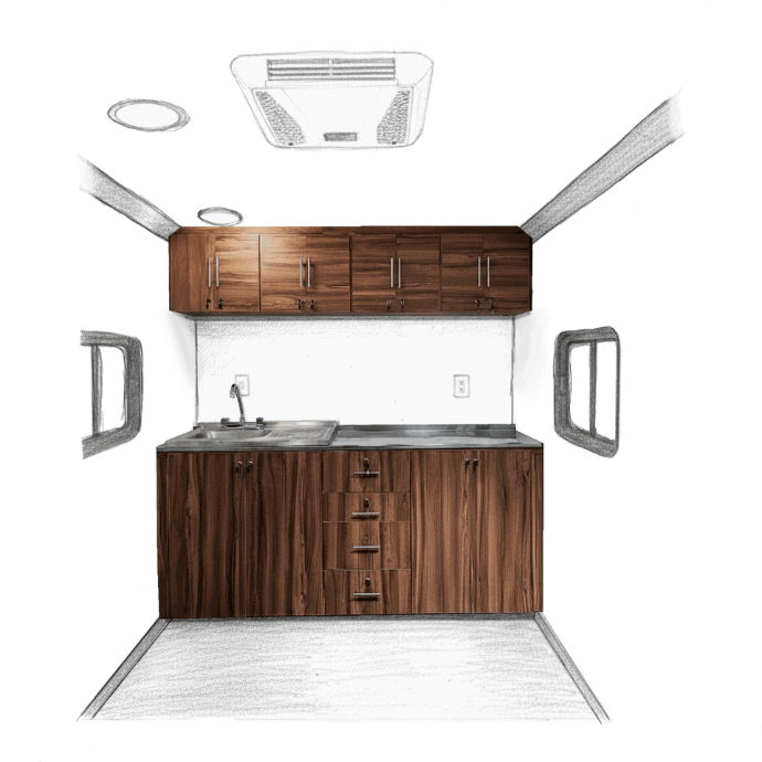 Equipada con bomba de agua, tanque de agua potable y tanque de agua residual.